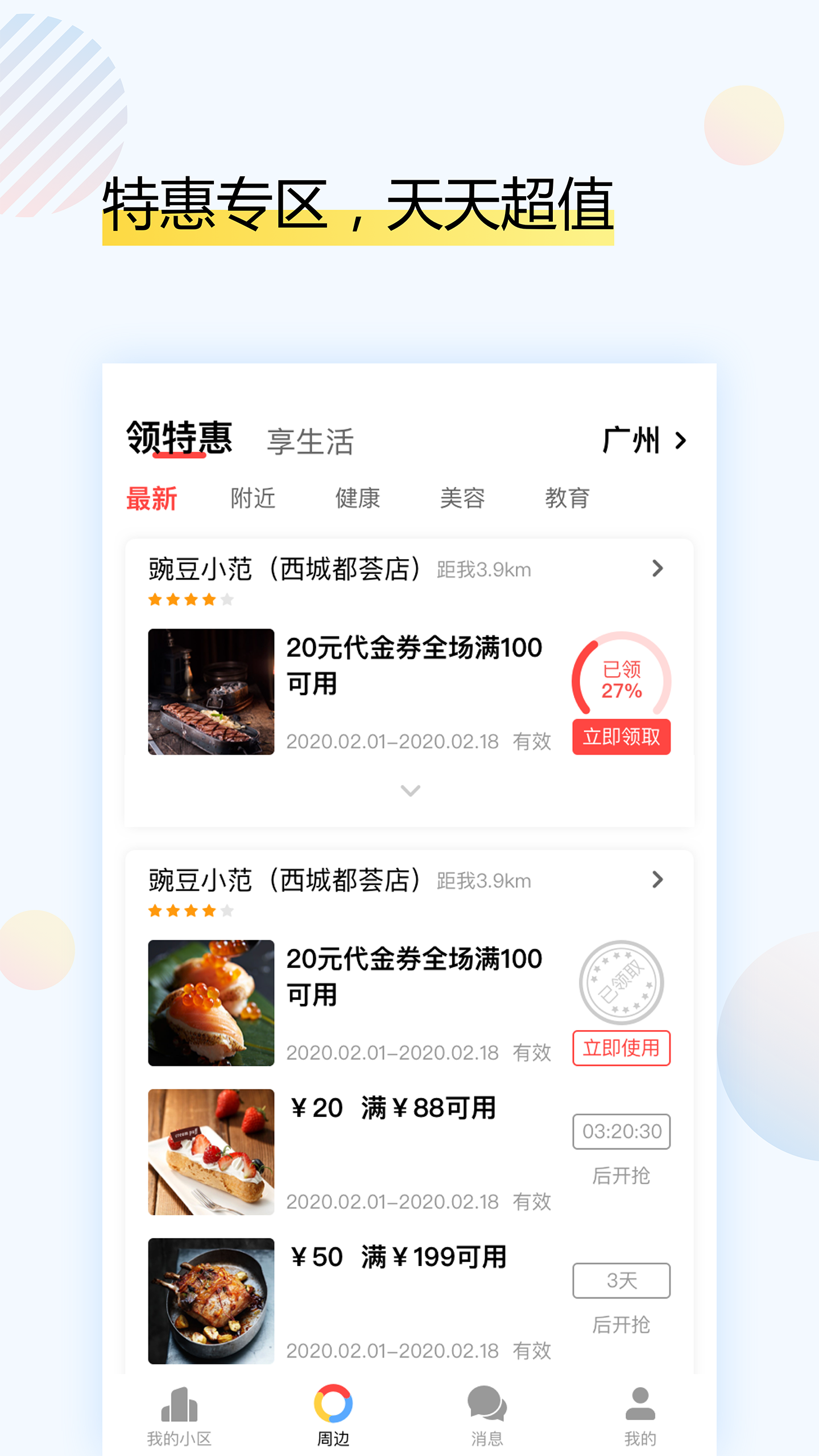 周边商铺,畅享生活:整合社区周边优质商家资源,提供餐饮、超市、家政等多样化服务,满足日常生活所需;