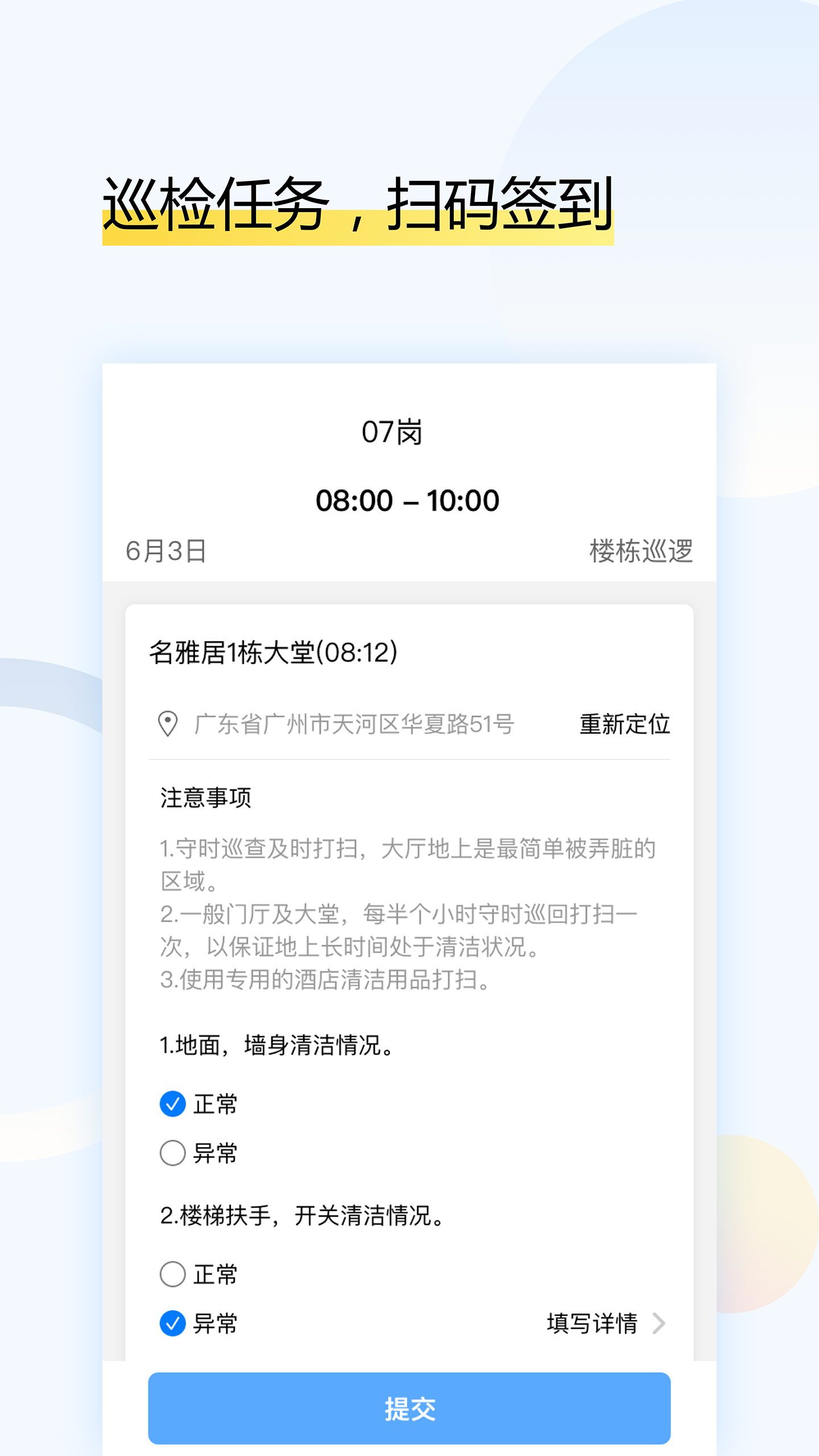 巡检任务,扫码签到:为物业管理人员提供便捷的巡检工具,通过扫码即可完成签到和任务上报,提高工作效率。