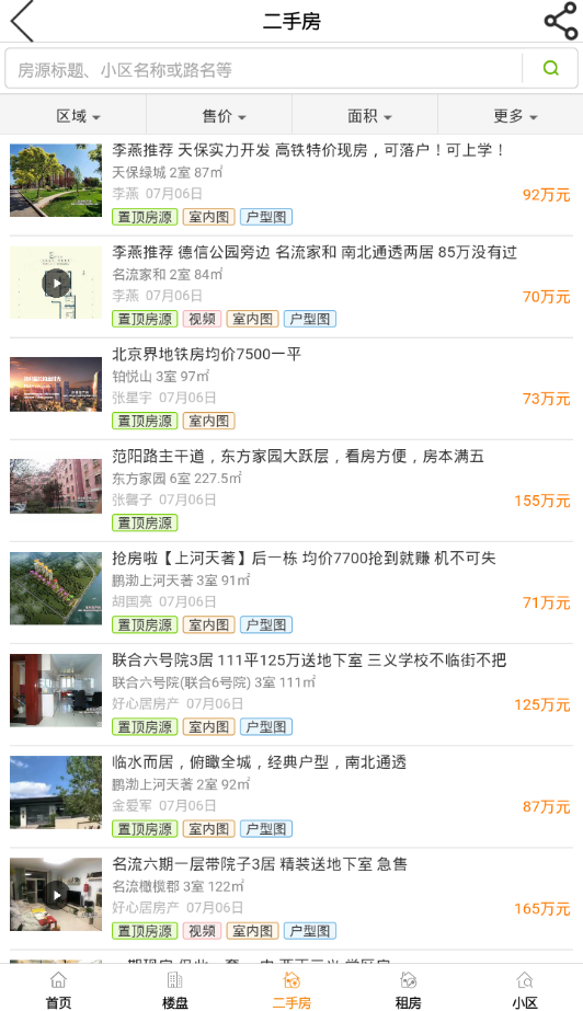 精确地匹配您的需求,多重条件查询功能,精确到您的小区;支持按价格区间、房型、朝向、装修程度等20余项条件筛选。