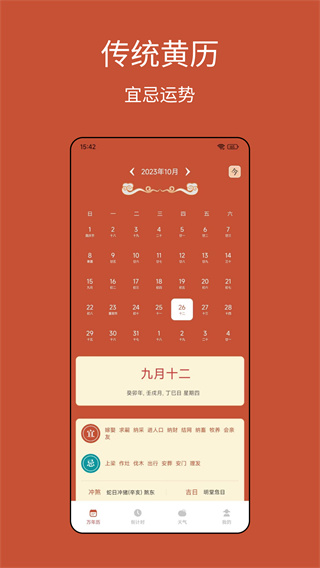 黄历功能涵盖嫁娶、开业、搬家等200+生活场景的吉时测算,支持自定义筛选条件生成专属黄历报表。新增"吉时对比"功能可同时显示多个日期的宜忌对比,帮助用户快速锁定最佳日期。