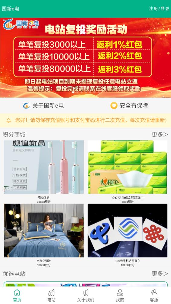 国新e电app是一款专注于新能源电站管理的智能平台,为用户提供便捷的在线认购、高效管理和稳定收益的一站式服务。通过创新的技术手段,平台让新能源投资变得简单透明,用户无需专业知识即可轻松参与。除了电站管理功能,平台还设有丰富的积分商城,用户可通过积累的积分兑换各类优质商品,实现投资与消费的双重价值。无论是个人投资者还是企业用户,都能在这里找到适合自己的新能源解决方案。