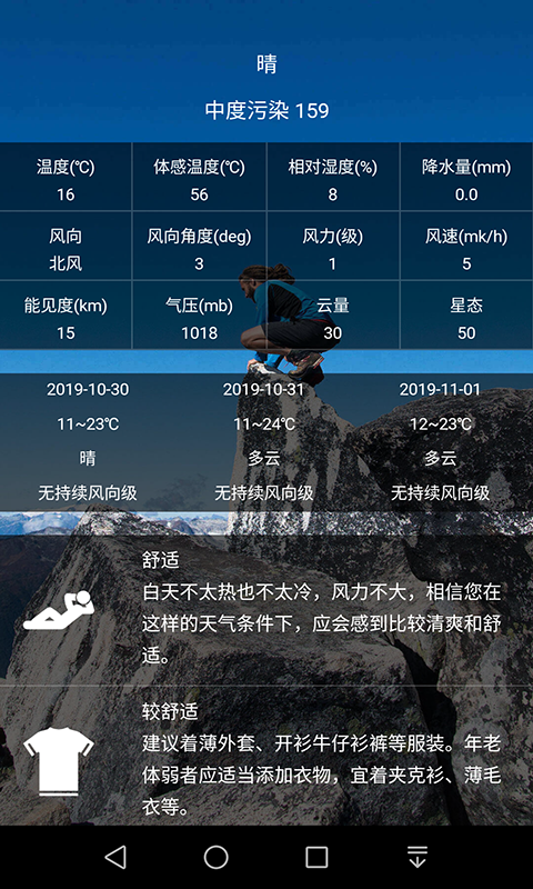 轻天气app的功能之丰富令人惊叹。它不仅提供常规的温度、体感温度等基础信息,还能展示相对湿度、降水量、风向、风向角度、风力等级、风速、能见度、大气压强、云量等专业气象数据。对于追求精准天气信息的用户,软件还特别提供了紫外线指数、空气质量指数等特殊指标,让您对天气状况了如指掌。