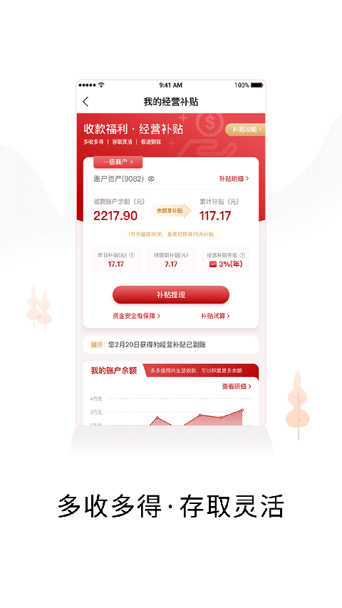 创新推出的阶梯式补贴政策,单日收款满1000元即可享受基础补贴,留存资金还可获得额外收益。新商户注册即赠30天黄金会员权益,包含手续费减免、专属客服等12项特权,助力商家快速起步。