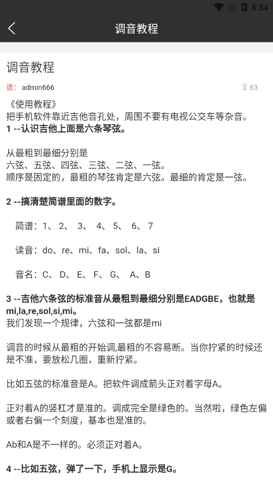 为了获得最佳调音效果,建议在安静环境中使用本软件。首先需要了解乐器基本构造,以吉他为例:从上到下六条琴弦分别称为六弦(最粗)至一弦(最细)。调音时应从最粗的六弦开始,逐步调整到最细的一弦,这样能有效避免琴弦断裂。软件采用国际通用的音名系统(CDEFGAB)和唱名系统(do、re、mi、fa、sol、la、si)双重标识,方便用户理解音高关系。调音过程中,软件会以直观的视觉提示(如颜色变化和指针位置)指导用户调整方向,当指针完全对准目标音名且显示为绿色时,表示调音准确。若出现偏差,可根据音阶顺序判断需要调紧或调松琴弦。