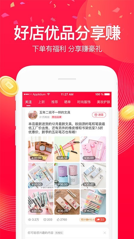 存钱自己用:微好店汇聚了海量用户,共同参与省钱又快乐的"秒杀"活动。注册即享VIP待遇,每件商品都配有专属优惠券,消费购物还能获得额外奖励,真正做到省钱又赚钱。平台每天都会推出闪杀、团购、砍价等精彩活动,让您享受不间断的购物乐趣。