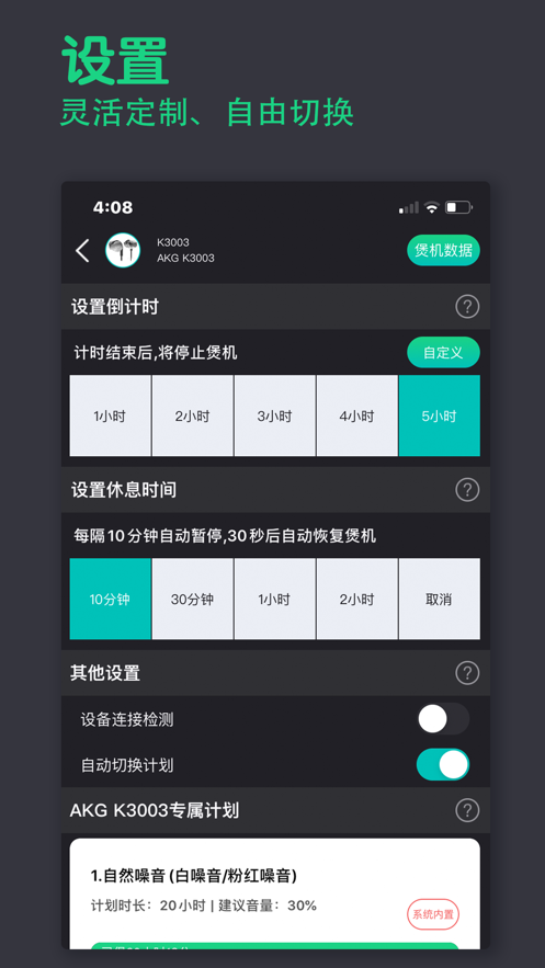 【自动休息设置】科学证明,适当的休息能让耳机振膜恢复最佳状态。您可以设置煲机1小时后自动休息2分钟,或者根据个人需求调整间隔时间,确保耳机在最佳状态下完成性能提升。