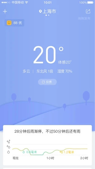 *完备的天气信息:15日天气预报、24小时天气预报、空气质量指数、空气污染指数、pm2.5、风力、湿度、温度、日出日落、气压、能见度、根据当日天气状况提供相应的生活建议,紫外线、指数、穿衣指数、洗车指数、运动指数、旅游指数一手掌握!此外还新增了花粉浓度监测功能,特别适合过敏体质用户。所有数据都以直观的图表形式呈现,让您一目了然。