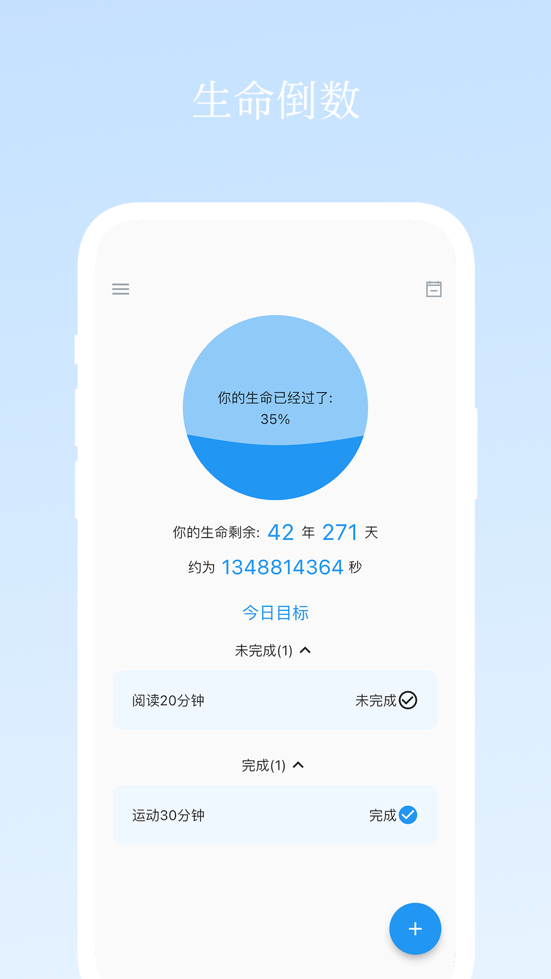 -生命倒数:计算此刻至生命结束的时长,对时间的年数与天数、秒数进行倒数。系统会根据用户年龄、性别等基本信息,结合权威医学数据,智能预测剩余生命时长,并以动态数字形式实时更新。