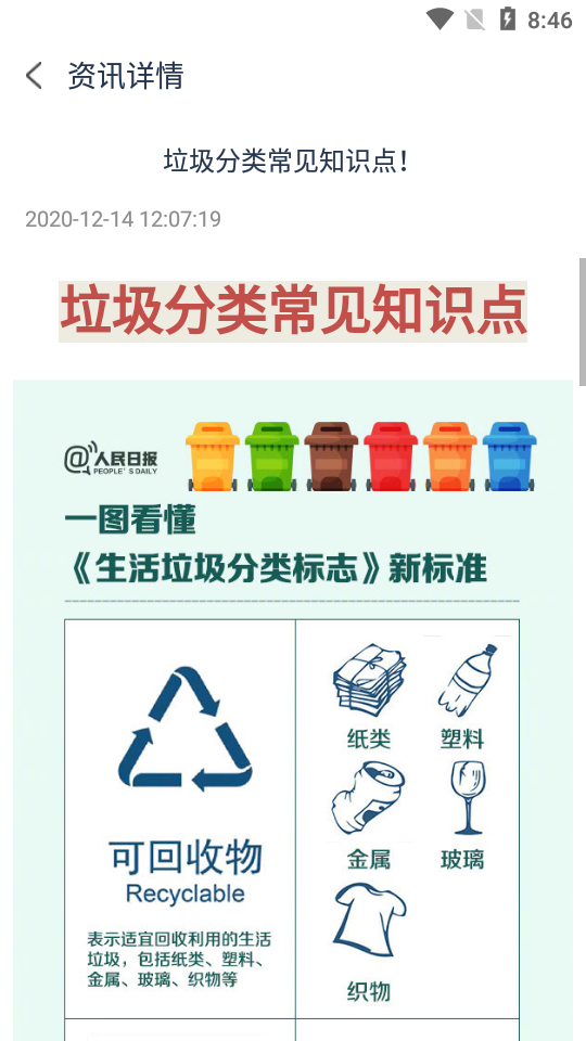 资讯推送服务:平台会实时推送最新的垃圾分类政策、环保知识和社区动态,帮助居民随时掌握环保资讯,持续提升环保意识。