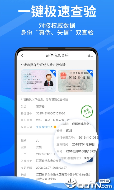 真伪/失信查询:将采集的身份证信息与权威数据做比对,一键检验身份证信息真伪!所有失信人信息都在案,一键查询,方便快捷,远离老赖!数据实时更新,确保查询结果准确可靠。