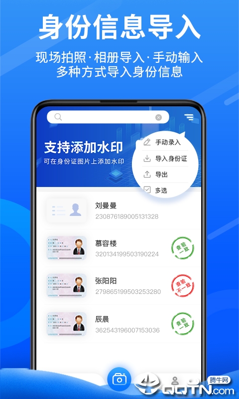 身份证信息导入:支持多种导入方式,扫描身份证、图库导入、手动输入,怎么方便怎么来!同时还支持批量导入功能,大幅提升工作效率。