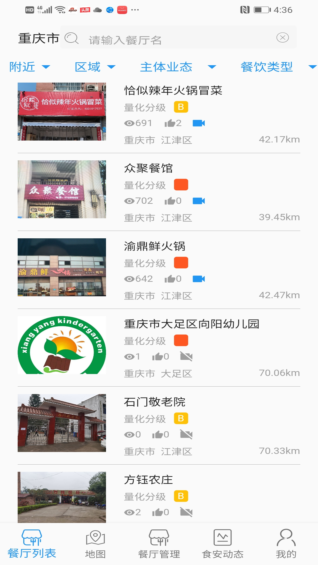 -餐厅列表、自检自查:提供周边餐饮店铺的详细列表,支持商家自主上传卫生检查报告