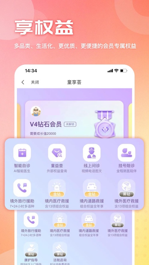 会员权益—大童专属会员权益,为您提供生活化、多样化的优质会员服务;包括购物优惠、出行特权等多项增值服务。健康医疗—智能自诊、线上问诊、挂号等服务,让您关注健康更方便;连接全国三甲医院资源,提供7×24小时在线医疗服务。全球救援—为您提供专业的道路救援、医疗援助等服务,让出行变得更放心!覆盖全球200多个国家和地区,随时随地提供紧急援助。