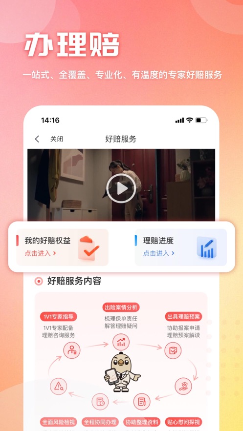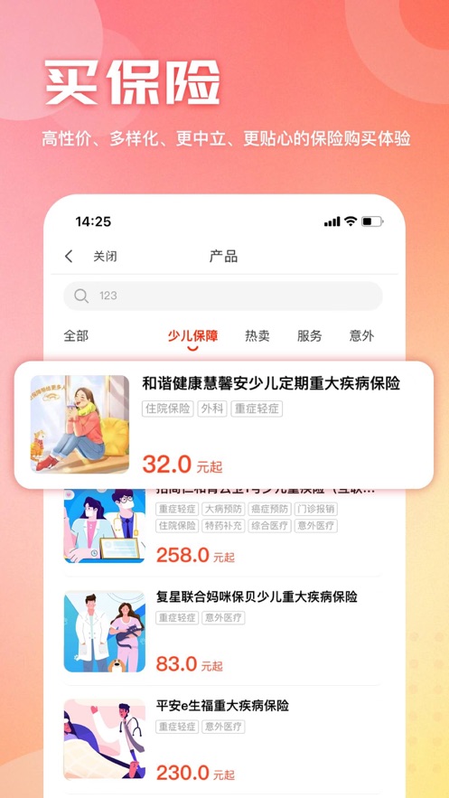 保单托管—将家庭现有保障情况进行整合分析,给出专业的风险保障建议;支持多保险公司保单统一管理,让保障情况一目了然。好赔服务—让保险理赔变得有温度、更便捷;提供全程理赔指导,简化繁琐流程,最快24小时完成赔付。—这里有丰富、多样的保险产品供您选择。涵盖健康险、意外险、寿险等全品类产品,满足不同人群的保障需求。