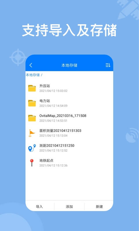 【本地存储】存储应用里的标记位置、轨迹、面积与导入的各种格式文件,如kml、kmz,支持分类管理;