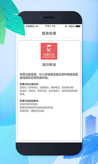垃圾所属分类查询功能支持海量物品数据库,涵盖日常生活中可能遇到的各种废弃物。通过图标、颜色、文字三重标识系统,让分类结果更加直观易懂。各类垃圾处理方式提示功能,特别针对有害垃圾提供专业处置建议。软件还包含常见垃圾示例库,通过具体物品帮助用户理解分类标准。各类垃圾的投放要求提示功能,详细说明不同垃圾的投放注意事项。