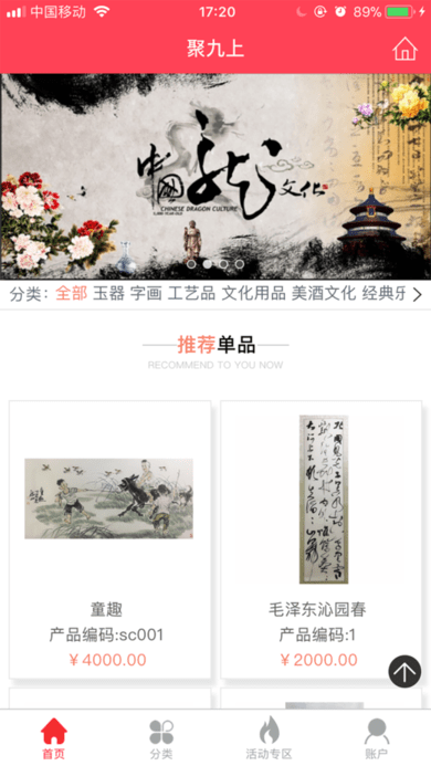 聚九上商城汇集了众多特色文化商品,包括国外原装进口红酒、中国传统国画/字画、精品茶品、钧瓷艺术品、民间工艺品、文化用品、经典乐器等。每一件商品都经过精心挑选,确保其艺术价值和收藏价值。