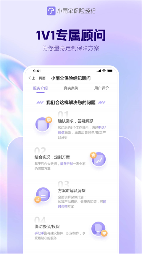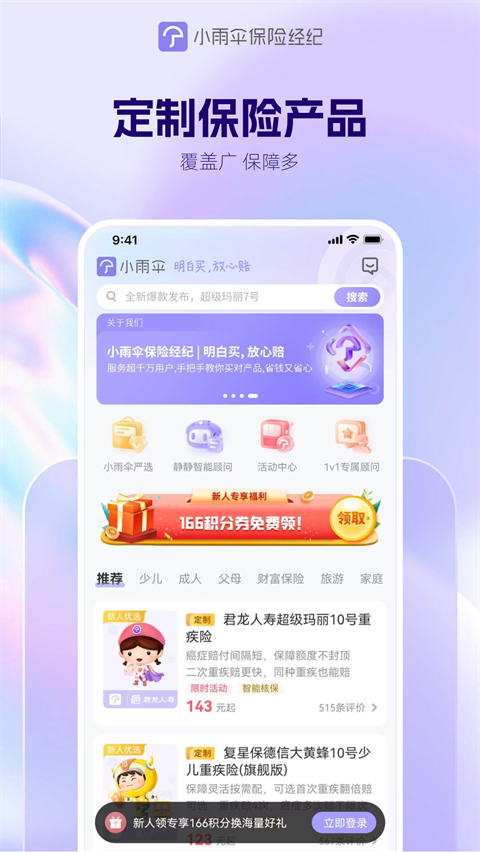 方案定制:独家研发智能保险定制师"静静",通过人工智能技术为用户免费定制专属保险方案,让保险配置更科学合理。