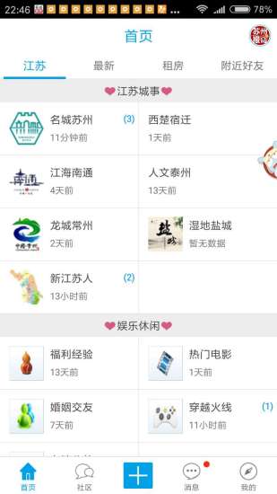 江苏城事频道汇集了全省各地的精彩内容,从名城苏州的繁华街景到西楚宿迁的历史底蕴,从江海南通的港口风情到人文泰州的书香气息,全方位展现江苏各地的特色风貌。龙城常州的现代活力与湿地盐城的生态美景相映成趣,新江苏人专栏则记录着外来建设者的奋斗故事。娱乐休闲板块更是包罗万象,既有实用的福利经验分享,也有热门电影推荐,还有婚姻交友等社交功能,火线栏目则聚焦当下最热门的话题讨论,为您带来丰富多彩的线上生活体验。
