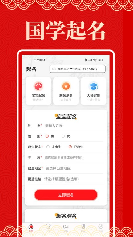 为每个宝宝定制别致好名字。好的名字必须结合人的性别、出生时辰、家族辈分等因素,系统会智能考虑这些要素,提供最合适的命名方案;