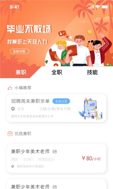 天安人力集全职招聘、技能服务、在线沟通于一体,打造一站式人力资源服务平台。在这里,用户可以浏览海量优质岗位信息,直接在线沟通预约面试,实现快速入职。同时,软件还提供个人技能发布功能,无论您擅长维修、保洁、设计制图还是编程开发,都可以将自己的技能发布到平台上,让有需求的用户直接在线沟通、预约下单并完成支付,实现技能变现。