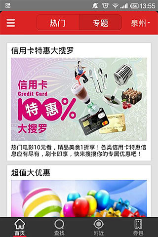 专题活动:每日精选超值福利,包括餐饮免单、观影优惠、超值抵价券等丰富活动,更有定期推出的1元抢购百元券等限时特惠。