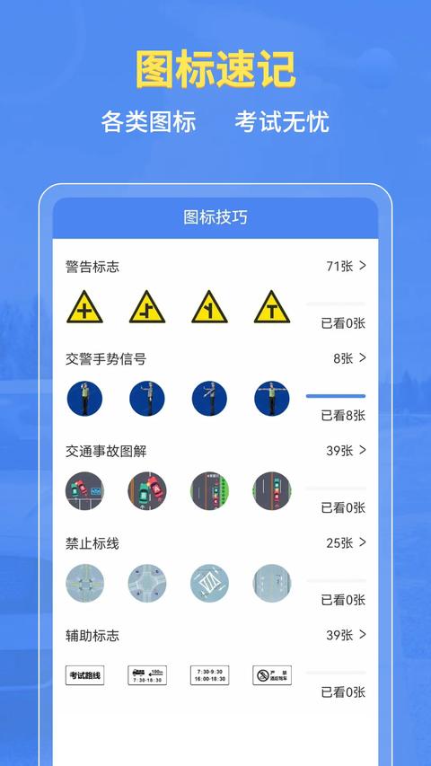 应试技巧由资深驾考专家团队总结的答题技巧和记忆口诀,帮助用户快速掌握考试规律。特别针对易混淆的交通标志、相似法规条款等难点,提供对比分析和记忆诀窍。