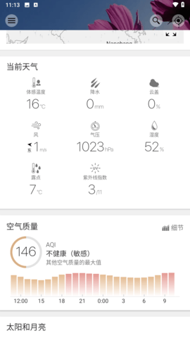 - 太阳和月亮:精确显示日出日落时间、黄昏时段、月相变化、满月新月日期以及月龄等信息,为天文爱好者提供专业参考。