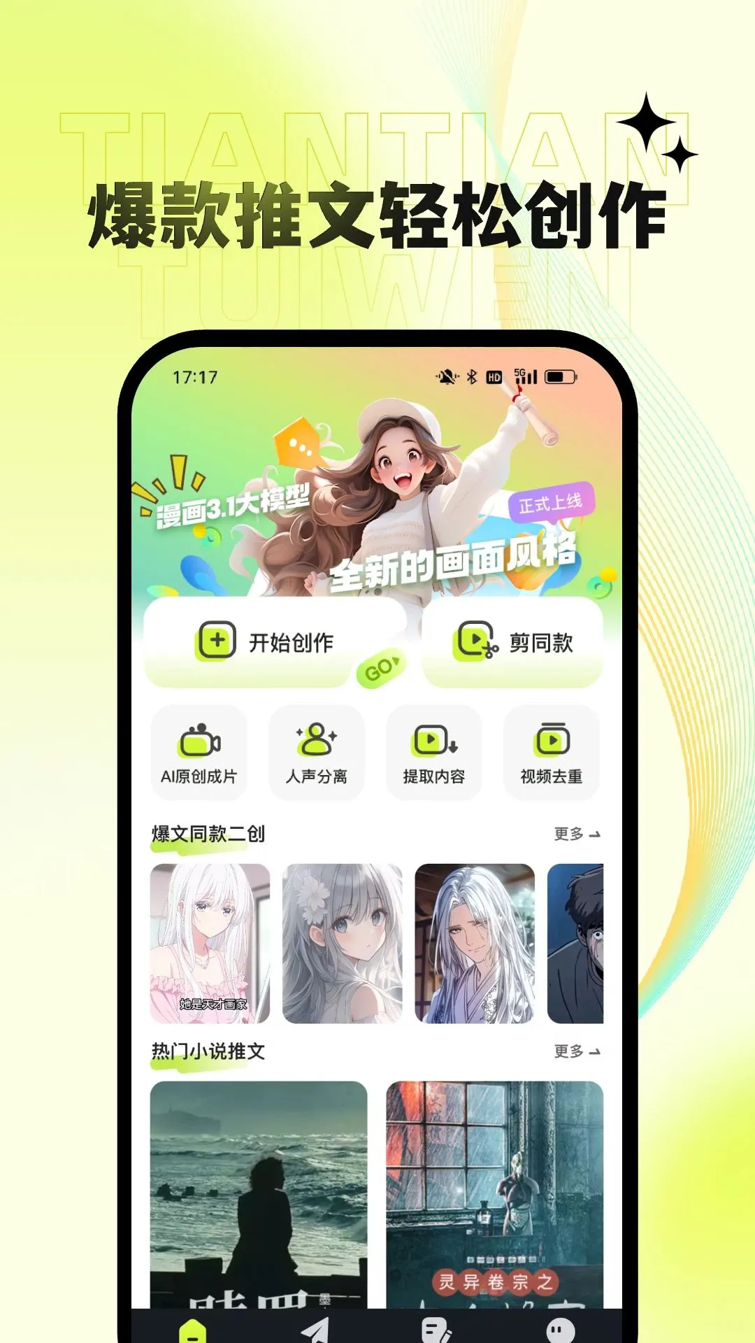 天天推文是一款专为小说推文创作设计的创新工具,无论你是刚入门的新手还是经验丰富的创作达人,都能在这里找到适合自己的高效创作方式。这款软件通过智能化的功能设计,让小说推文创作变得前所未有的简单有趣,绝对能给你带来耳目一新的体验。