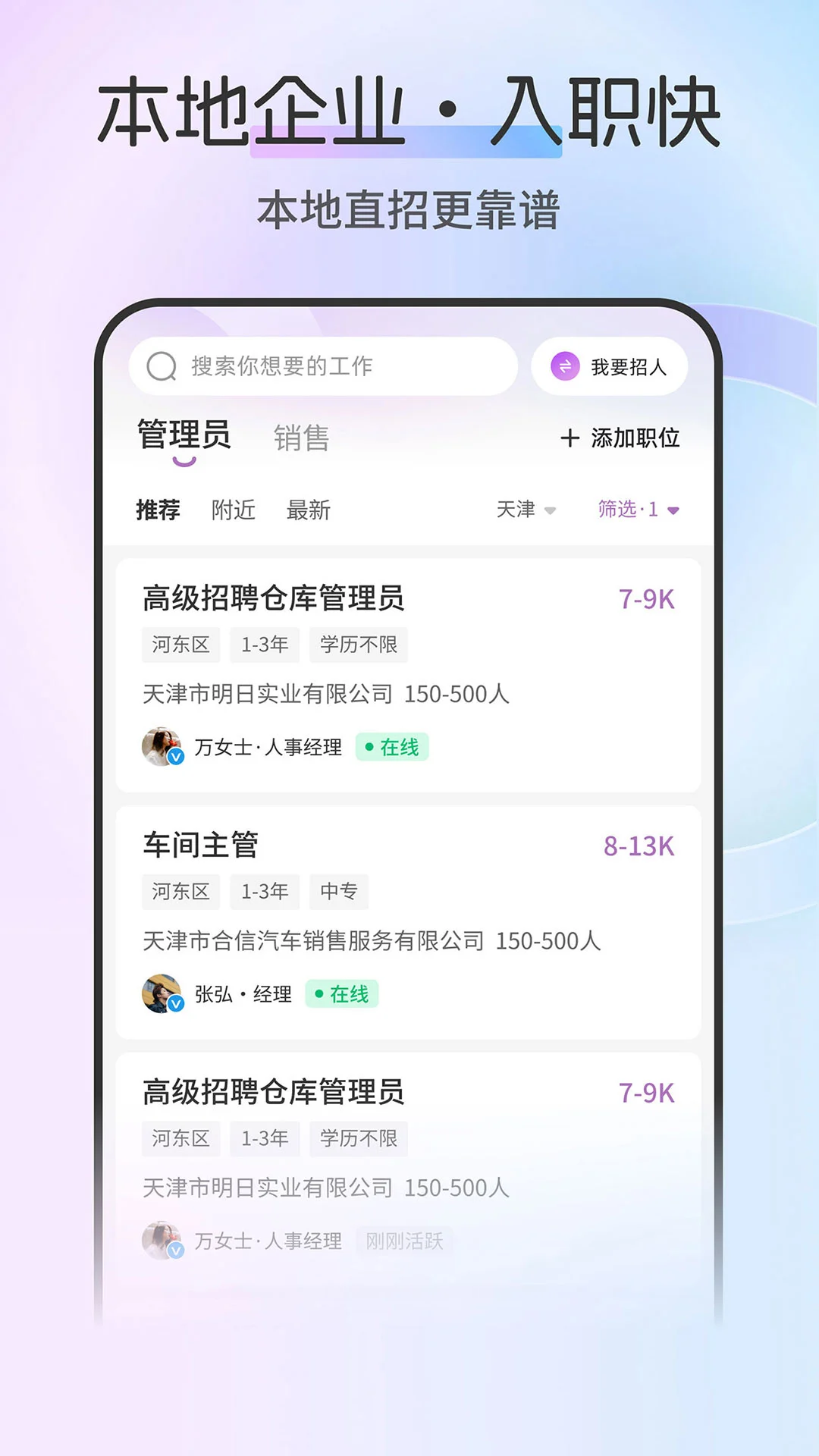 天津直聘是一款专为天津本地用户打造的求职招聘APP,致力于服务行业的高效人才匹配。平台采用前沿的人工智能与大数据技术,精准连接企业与求职者,让招聘流程更智能、更便捷。企业可免费发布岗位信息,享受无限沟通特权,大幅降低用工成本;求职者则能通过智能推荐快速找到心仪工作,甚至实现"一小时极速到岗"。平台独创的聊天直聘模式让劳资双方沟通零距离,同时严格的信息审核机制和隐私保护功能,确保每份工作的真实可靠,让求职招聘更安心。