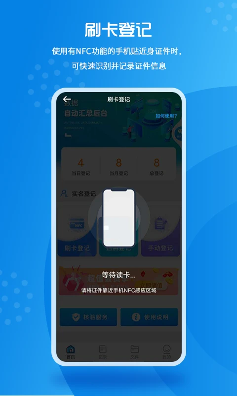 对于不支持NFC功能的设备,用户可以通过手机相机扫描证件来完成信息采集。该功能采用先进的OCR识别技术,能够准确提取证件上的文字信息。操作简单直观,只需将证件平放并对准取景框,系统会自动完成识别和录入。这项功能特别适合临时需要登记少量证件的情况,或在没有NFC设备时的替代方案。识别速度快,准确率高,大大提升了工作效率。