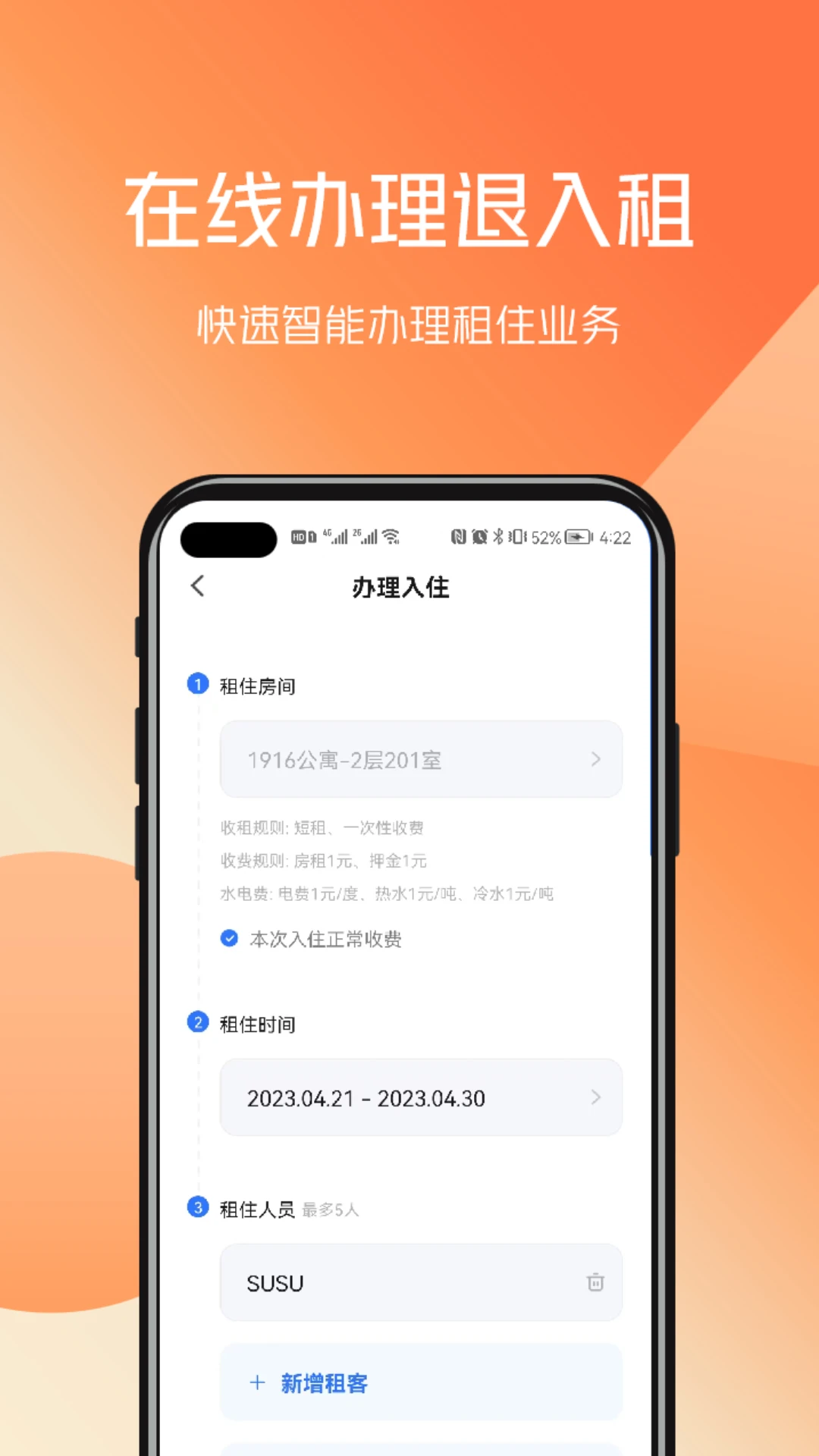 『在线办理』在线远程办理入住,并且通过系统发送办理成功短信提醒,并自动生成账单。整个签约流程采用电子合同签署,支持人脸识别实名认证,确保交易安全可靠,租客可随时在手机端查看合同详情。