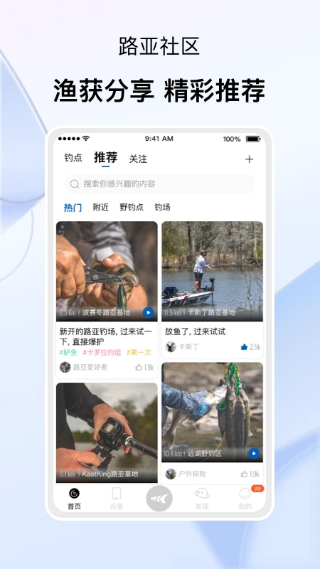 玩路亚卡斯丁的路亚社区是一个充满活力的交流平台,用户可以在这里分享自己的渔获、钓鱼技巧和心得体会。社区还会根据用户的兴趣推荐精彩内容,包括热门钓点、装备评测和钓鱼教学视频。无论是展示个人成果还是学习他人经验,路亚社区都能为用户提供丰富的互动机会,让钓鱼不再是一个人的孤独运动。