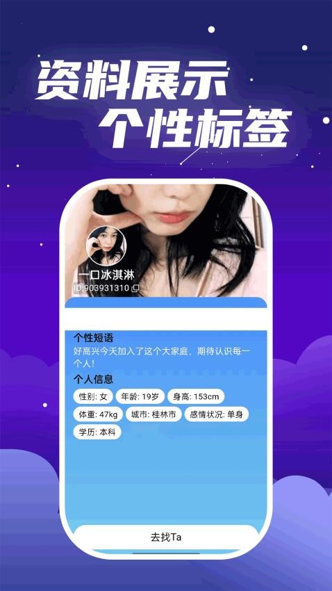 用户可以在软件上进行个性标签设置,便于软件为你智能推荐心动的TA。系统提供上百种个性标签可选,还能自定义添加专属标签,让匹配更加精准高效。