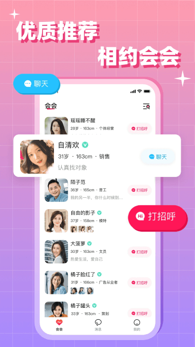 在会会遇见心动之人,可向ta发起视频通话哦,开启你们的心动之旅。高清画质和稳定的连接保证你们的交流畅通无阻,让感情在面对面中升温。