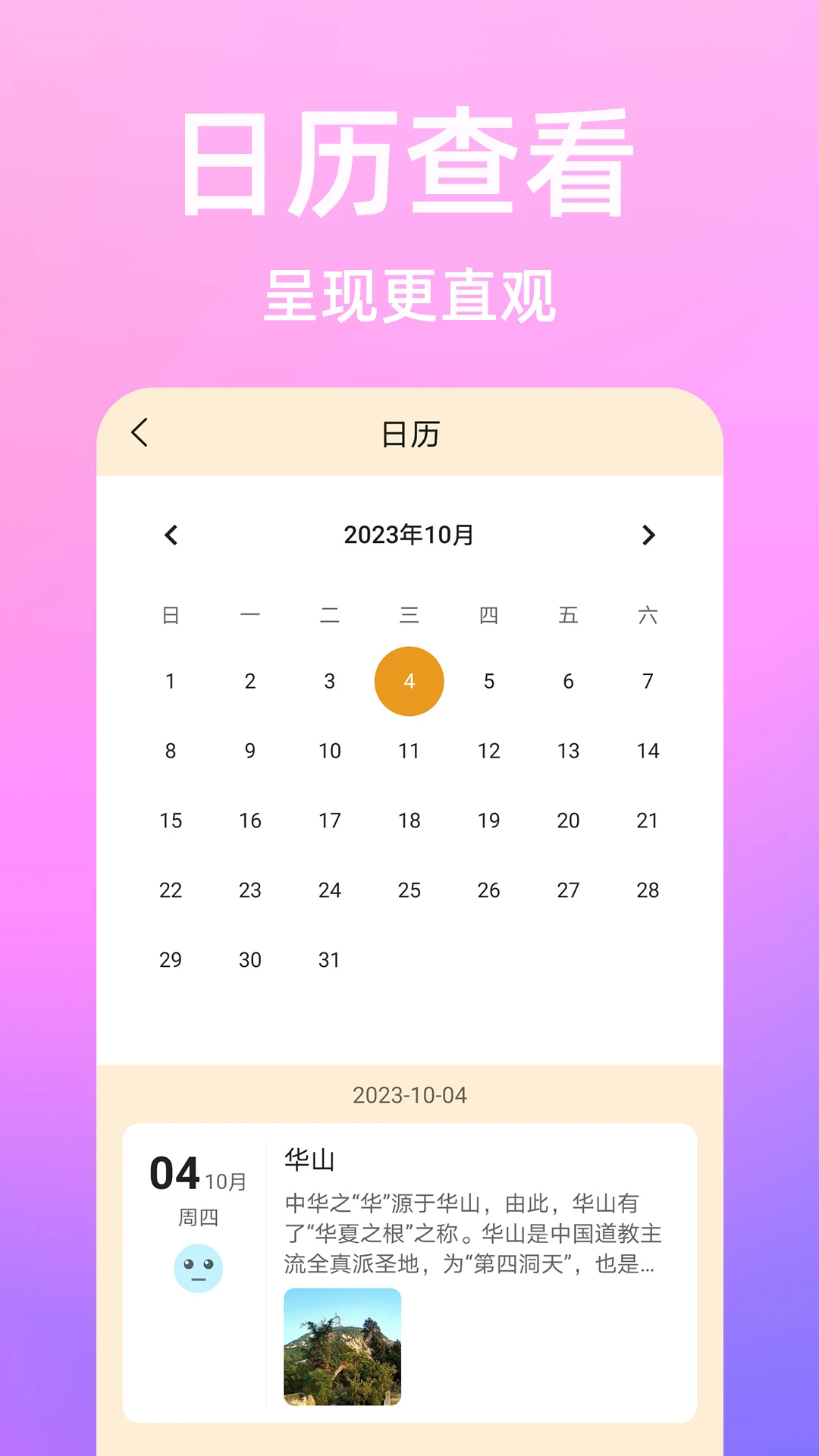 以日历视图直观展示日记记录情况,通过颜色标记区分不同心情的日记。点击任意日期即可查看当天记录,让时间管理更加清晰有序。