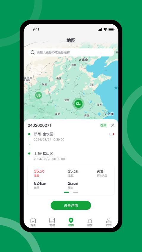 采用高精度地图展示各监测点的位置信息,支持缩放和定位功能。用户可以清晰查看设备分布情况,实时掌握物品运输状态,确保全程温度可控。