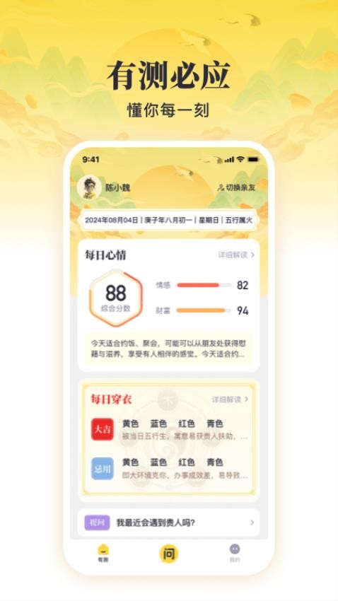 有测必应app是一款集传统文化传播与现代生活应用于一体的综合性平台。它不仅提供了丰富的传统文化知识,还配备了多种实用的测算工具,真正实现了传统文化智慧的现代化应用。平台对用户的每日吉凶进行专业测算,帮助获取更多好运。同时,精准的运势解读和卡牌指引服务,为用户的生活决策提供了有价值的参考。专业的服务团队确保所有内容都经过严格审核,让用户获得最可靠的文化服务。无论是想学习传统文化知识,还是寻求生活指引,有测app都是您理想的选择。
