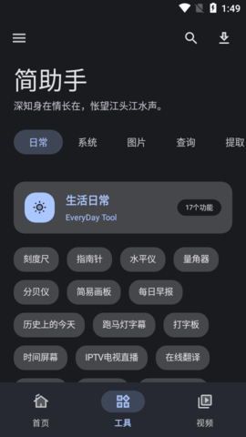 简助手是一款功能强大且永久免费的手机工具箱软件,它不仅界面设计美观,还集成了多种实用功能,能够满足用户日常生活中的多样化需求。这款软件最大的特点在于完全免费且无广告干扰,用户无需注册或登录即可直接使用所有功能,真正做到了即开即用。无论是下载高清壁纸、解析短视频内容,还是快速搜索音乐资源,简助手都能轻松胜任,为用户带来便捷高效的体验。