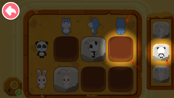 了解数与量的基础含义!矩阵左侧提示框是圆形,上方提示框分别是数字1和2。宝宝开动脑筋,把2个圆形放到第一行第二列。1个圆形,放在第一行第一列正确吗?去考考爸爸妈妈。