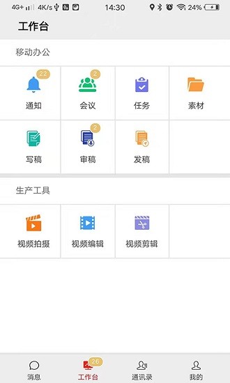 工作台整合了所有工作相关功能,您可以查看收到的通知、会议安排和任务分配。素材库管理功能让您随时调取已上传的素材,移动写稿、审稿、发稿功能让新闻生产流程更加流畅。视频拍摄和编辑功能一体化设计,让您从采集到发布一气呵成。