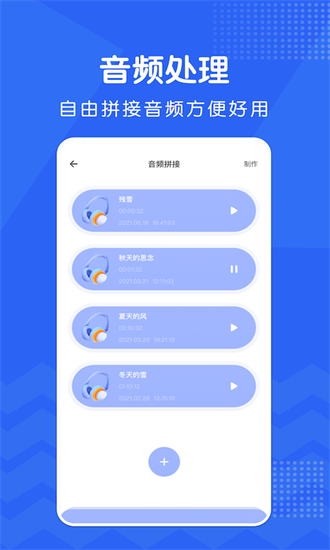 歌曲剪辑拼接为一体,串烧喜欢的歌曲吧!支持无缝拼接,过渡自然流畅,让你的音乐串烧更加完美。