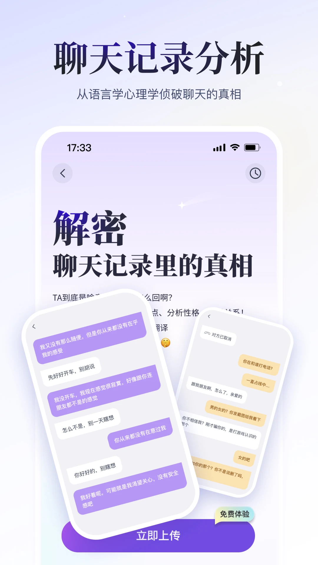 上传聊天截图,AI深度解析对话背后的情绪、意图与隐藏含义,助你洞察关系动态,读懂每一句话的潜台词。这项功能运用自然语言处理技术,不仅能分析文字表面的意思,更能捕捉字里行间的情感变化,帮助你更好地理解他人,改善沟通方式,建立更健康的人际关系。