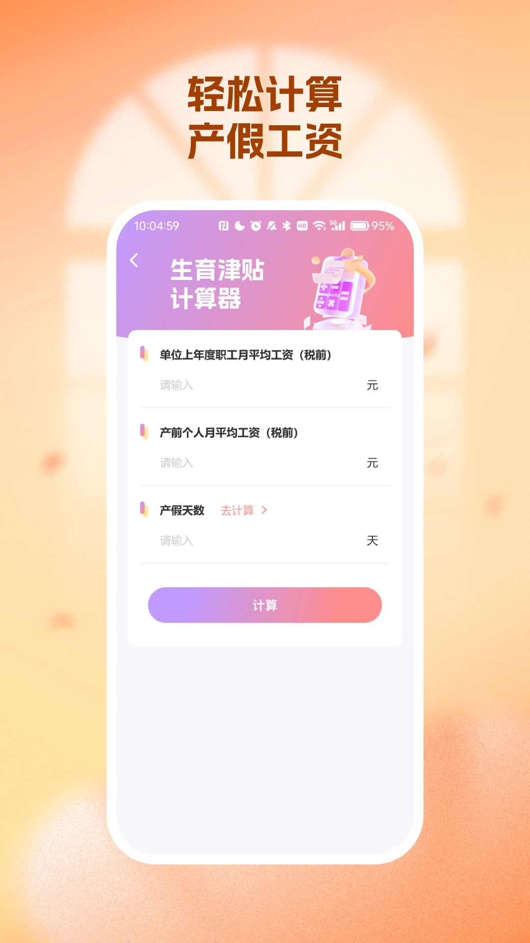 生育津贴计算器操作简单,只需填写单位平均工资、个人产前工资等基本信息,系统就会关联产假天数,快速计算出产假期间的工资收入。这个功能让您能够提前做好家庭财务规划,避免收入波动带来的困扰。