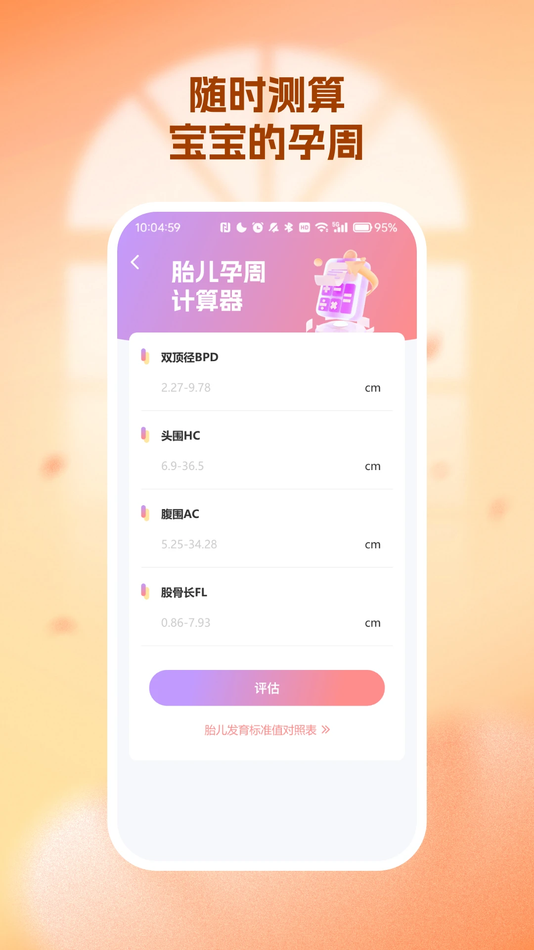胎儿孕周计算器功能实用,通过录入双顶径、头围等检查数据,就能快速评估当前孕周。系统还提供详细的胎儿发育标准对照表,让您能够直观了解宝宝的成长情况。这个功能特别适合关心胎儿发育的准妈妈们,让您随时掌握宝宝的成长进度。