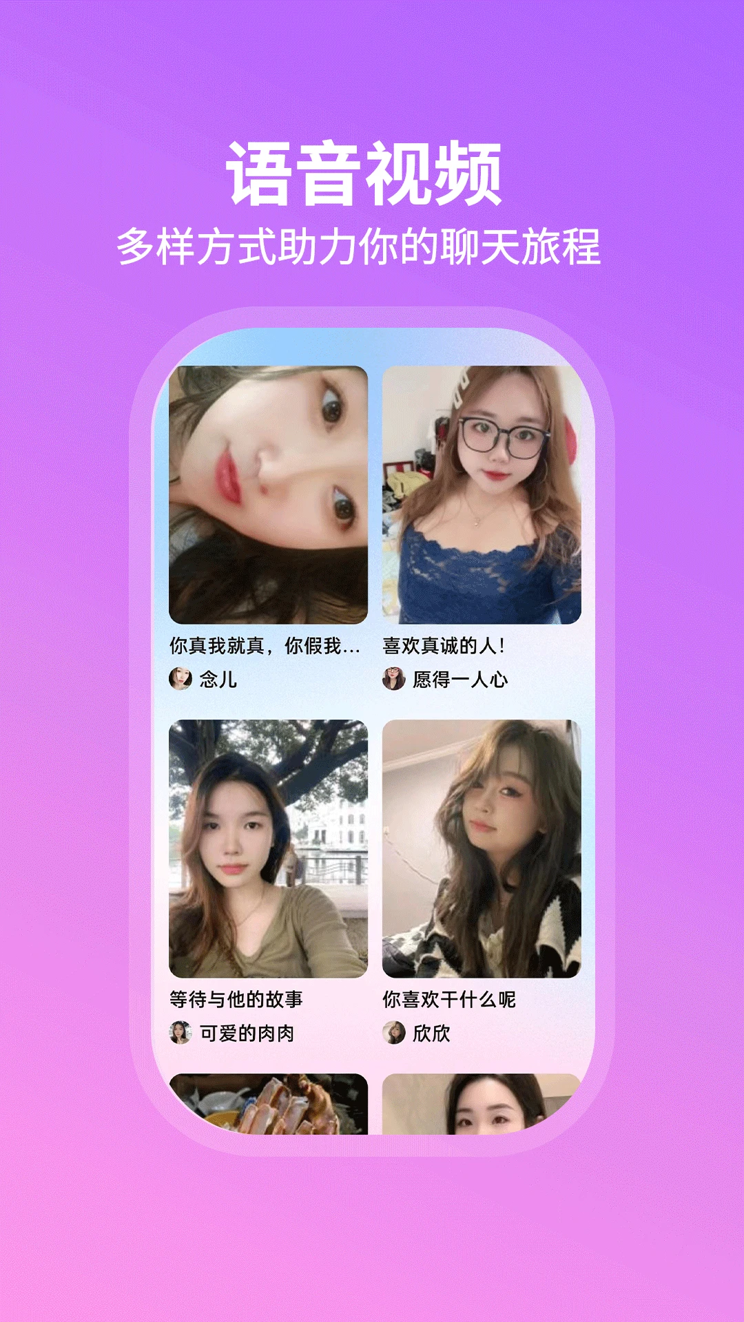 我们深知现代人对真诚交流的渴望,因此特别设计了"视频语音"功能,摒弃了传统社交软件中的套路和虚假信息。在这里,你可以选择最适合自己的聊天方式,告别无聊的尬聊,享受真实有趣的互动体验。高清画质和清晰音质保证了每次交流的质量。