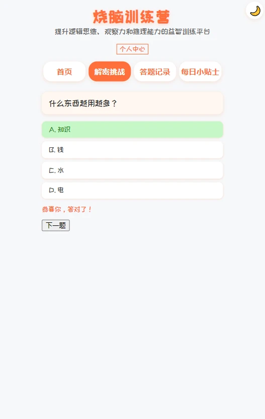 平台采用阶梯式难度设计,从基础到高阶循序渐进。每道题目都经过专业团队反复验证,确保训练效果。特别加入的"错题重练"功能,能针对薄弱环节进行强化训练。最新上线的"脑力图谱"功能,通过可视化数据帮助用户全面了解自身优劣势。