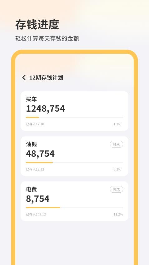 4、存钱进度功能可以帮助您制定合理的储蓄计划。设置目标金额和时间后,系统会智能分配每日/每周/每月储蓄金额,并实时跟踪进度。