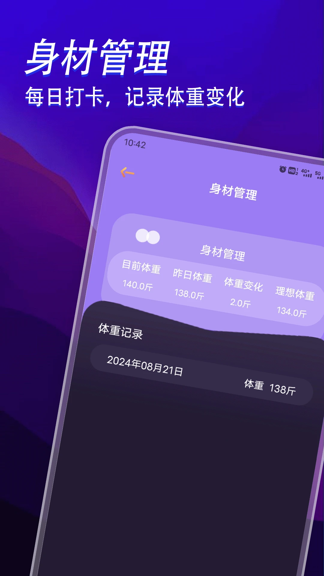 最值得一提的是软件的身材管理计划功能,它能根据你的身高、体重、年龄和运动习惯,智能生成个性化的饮食和运动方案。你可以设定目标体重,软件会每天为你规划合理的饮食结构和运动量,并实时跟踪进度。此外,它还提供详细的营养分析报告,帮助你全面了解自己的健康状况。