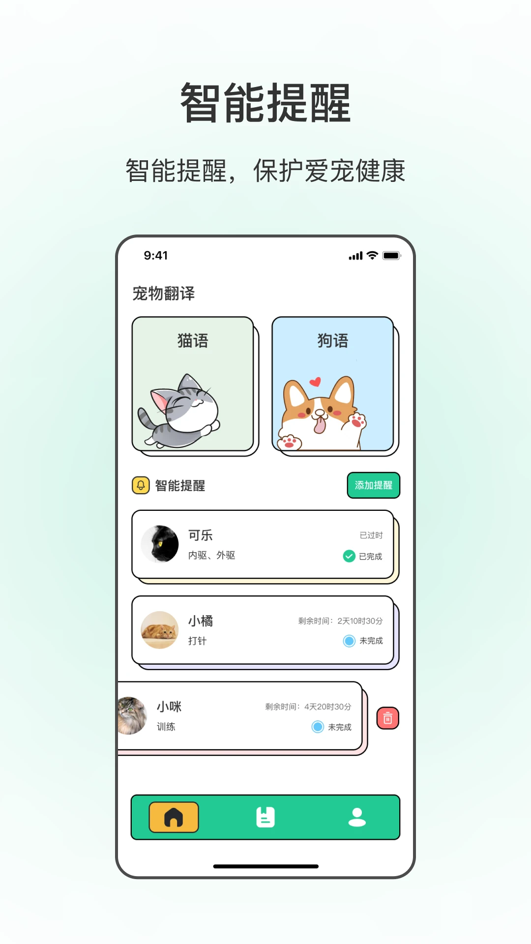 【智能提醒】贴心的提醒系统可以帮助您记录宠物的各种重要事项,包括疫苗接种、牙齿清洁、训练计划、驱虫时间等,再也不用担心错过任何重要时刻。
